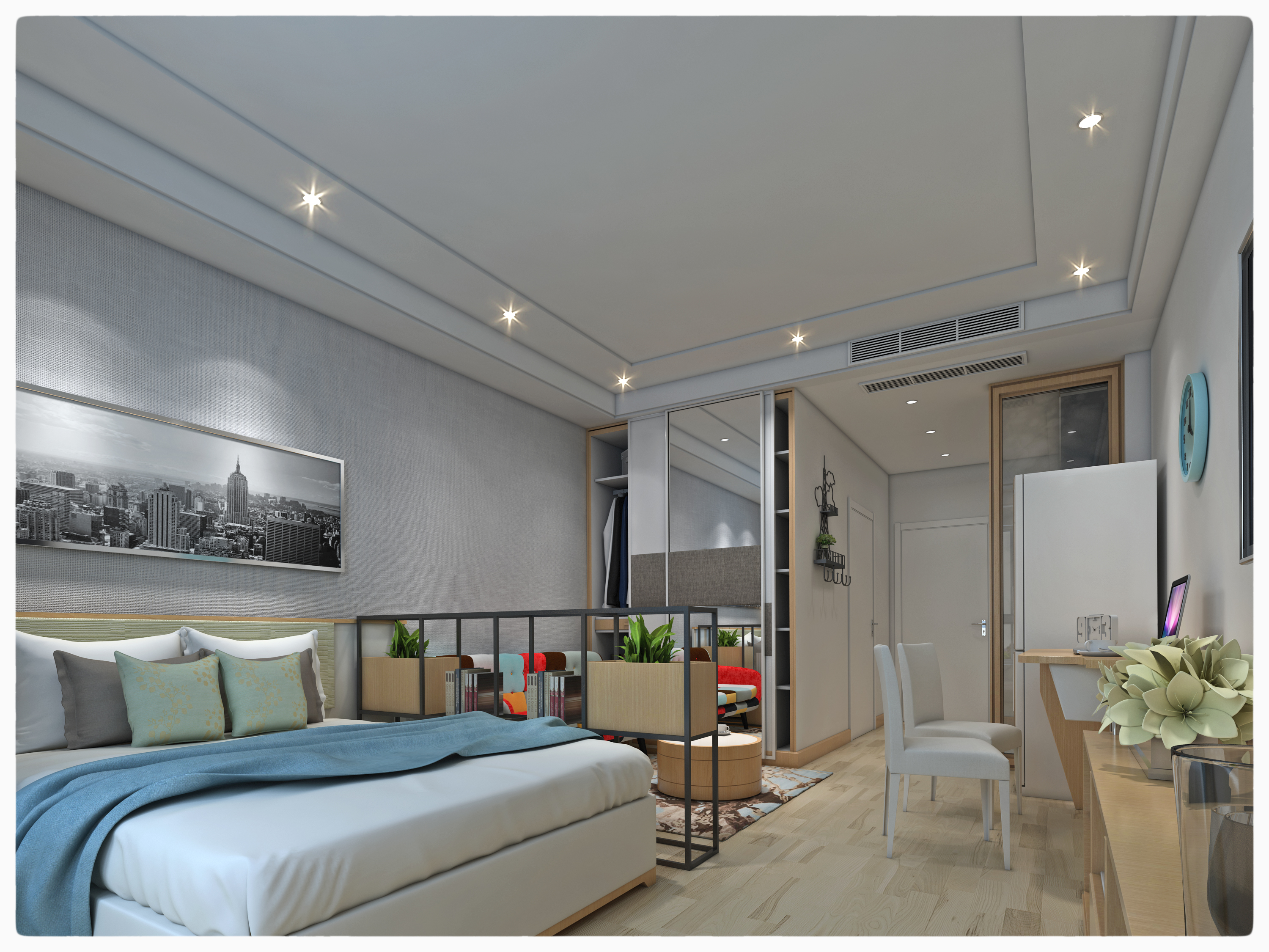 一个大衣柜足够,但是要想办法把储藏空间变成常用空间,方法就是把柜门减小,下面增加抽屉,配合柜子内的挂衣杆,不用叠,不会皱,而且能容纳衣服的量巨大。