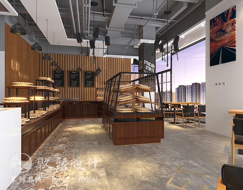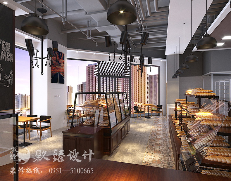 灯饰的搭配呢?设计师以都市范儿,文艺的格调来作为画龙点睛的作用,这样可以体现出与众不同的品味,突出了蛋糕店的品牌。