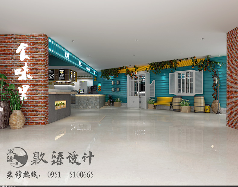 门头是一家店铺的形象,在人员密集的商场,餐饮店不仅仅靠的是食物,一个好看的门头能让人第一眼看到就想要进去消费,本案例客户对于门头的设计要求比较高,所以找了一个专门的工装设计师来设计一套最满意的门头,本案例由银川装修公司镹臻装饰|餐饮设计师桂淑萍完成,为了突出美食原生态的特色,主体墙面使用了湖蓝色,更能凸显环保,绿色。