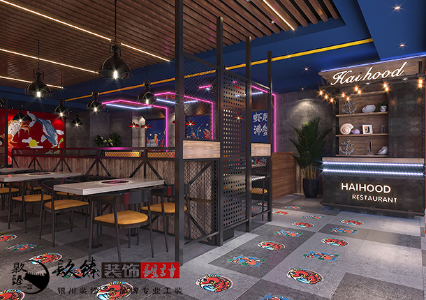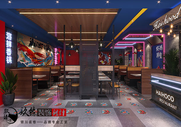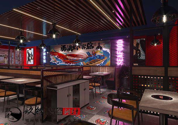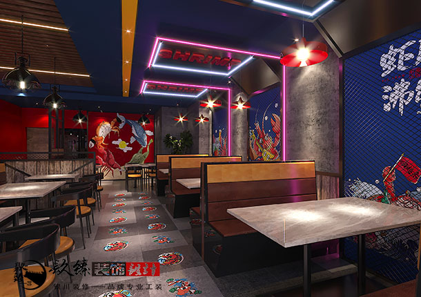 今天小编为大家重磅推荐银川火锅店装修镹臻装饰最新案例“大武口虾哥鱼妹纸包香锅,这是一家专注于做“潮鱼与美虾“的特色餐饮,小编看到效果图之后真的就被惊艳到了,色彩的冲击使人看了之后内心有一种蠢蠢欲动的感觉,还没被美食吸引,就首先被装修吸引进去了。本项目位置在大武口万达广场,面积为120平米,银川装修|火锅店装修设计整体风格为工业风格,现在的工业风格餐厅越来越多,但是真正能把工业风格的美以正确的搭配展示出来的餐厅却没有多少,工业风格不只是按部就班的在空间内植入一些金属水管等材质那么简单,最终要的是如何将这些风格元素以更专业更自然的设计手法植入当中。而设计上鲁玫,就将这一点做的很好,本案例只是稍微的融合了一部分的工业风元素,比如吊顶,软装的桌椅配饰、金属隔墙、工业吊灯等等。