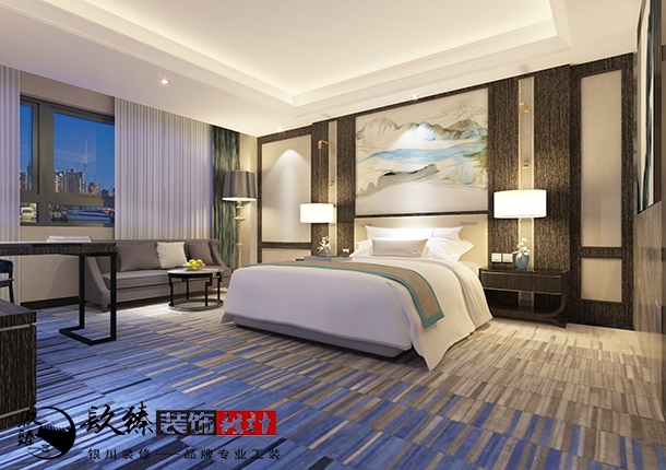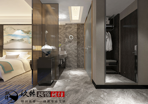 该酒店展现设计的大床房给人一种当代艺术感,墙面以及床头的挂饰犹如一幅水墨画,飘飘而来,轻轻而去。除了具有文艺气息的装饰画以外,最具有现代感就属地面的地毯和进门的衣帽柜了,设计师利用金属与木头两种不同的材质搭配展现出现代的时尚感,一间平米不大的大床房间瞬间被银川装修公司银川酒店装修设计刻画的高大尚了起来。