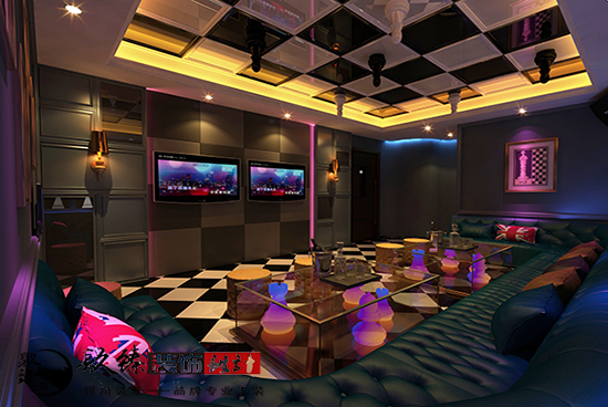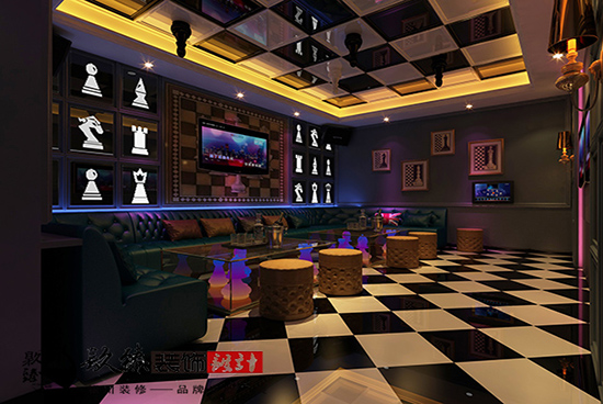 银川装饰公司镹臻装饰的设计师为了达到场所的要求,大量使用暗色系的搭配,大包间顶面利用国际象棋为元素进行吊顶的装饰,恰好和地面黑白格子的地砖相互搭配,更具对称感,另外墙面也是用国际象棋的棋子作为点缀,国际象棋的形象非常的有个性,国王,骑兵等等的造型简单而生动。
