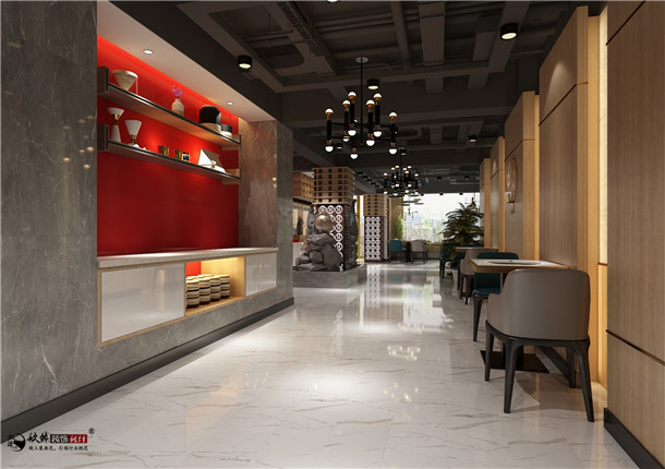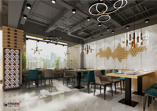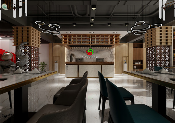 从入口到大厅,再由大厅到包房,区域划分合理完美:硬质实木板材、兰色硅藻泥涂料、镂空红砖墙体以及不加装饰略带有重金属味道的顶部空间,由专业厂家订制的仿真树,通过设计师的创作设计使得整个空间显得那么雅致清新有格调,为每一位来此品尝美味的食客不仅有美味对味蕾的冲击,更能有空间环境带给大家的惬意和回味。 颜色可以用来改变火锅店设计空间感知和帮助火锅店创造一个或多或少的亲密度。浅色和冷色这两种颜色都很柔和,颜色很淡,倾向于后退,使小空间感觉更大,但也不那么正式,也不那么亲密。相反,深色和暖色倾向于向前发展,使大空间不仅感觉更小,而且更个人化和亲密。