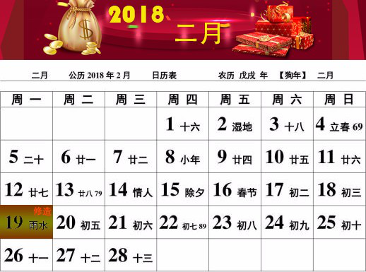 公元2018年02月19日 农历01月04日 星期一 水瓶座