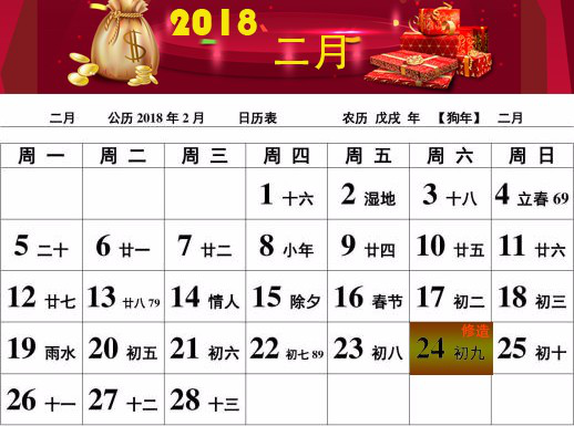 公元2018年02月24日 农历01月09日 星期六 双鱼座