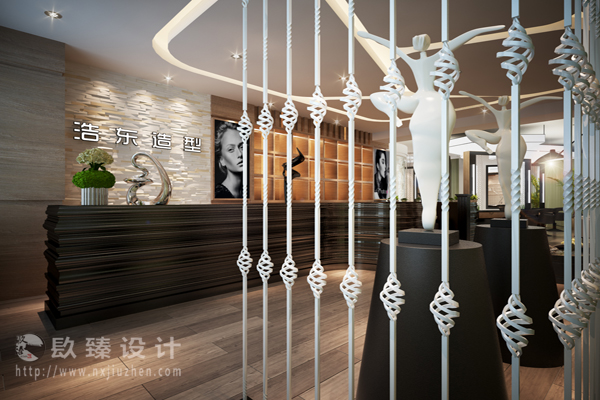 在浩东造型室内,用一些小雕塑和植物来装饰,再搭配一些珠帘,更让整个美容美发店的时尚感增强。