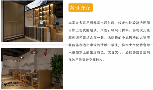 本案为现代中式火锅店装修设计方案,在本次火锅店设计中,设计师关注的不仅是需求的满足,同时也更注重风格的设计,在空间设计中设计师引入了新中式的元素,在设计师看来如今的餐饮环境,就餐环境是就餐中很重要的一环,故此设计师希望从里到外让客户感受到火锅店的不同。