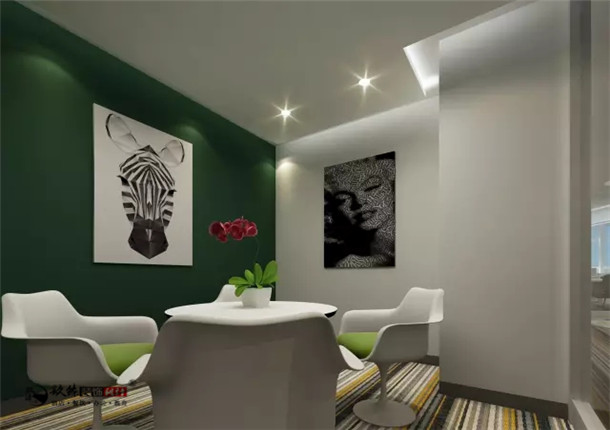 洽谈区的墙面则用乳胶漆、白色乳胶漆相互配合,在塑胶地面的配合下,墙面上的艺术挂画、石膏吊灯配合灯带,这一系列设计元素,都能在色彩搭配和设计元素搭配中,展现出洽谈区轻松愉快的氛围。