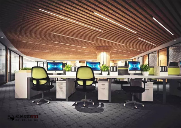 大厅设计中,设计师们将空间分为接待区与开放办公区,在设计元素中则同样使用塑胶铺设地面、生态木造型吊顶配合LED铝合金灯管,以此来增加空间的自然感和明亮度;再加上木质造型图书柜,在自然的木质元素中,体现现代风格所追寻的与众不同。