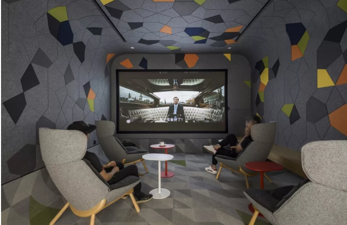 设计师将银川办公室设计主题定为“游乐场”,把活动空间分为三部分,展示了大多数人的成长历程。首先以儿时玩的万花筒为主题的VIP影院,希望从影院中看到懵懵懂懂的童年时光。