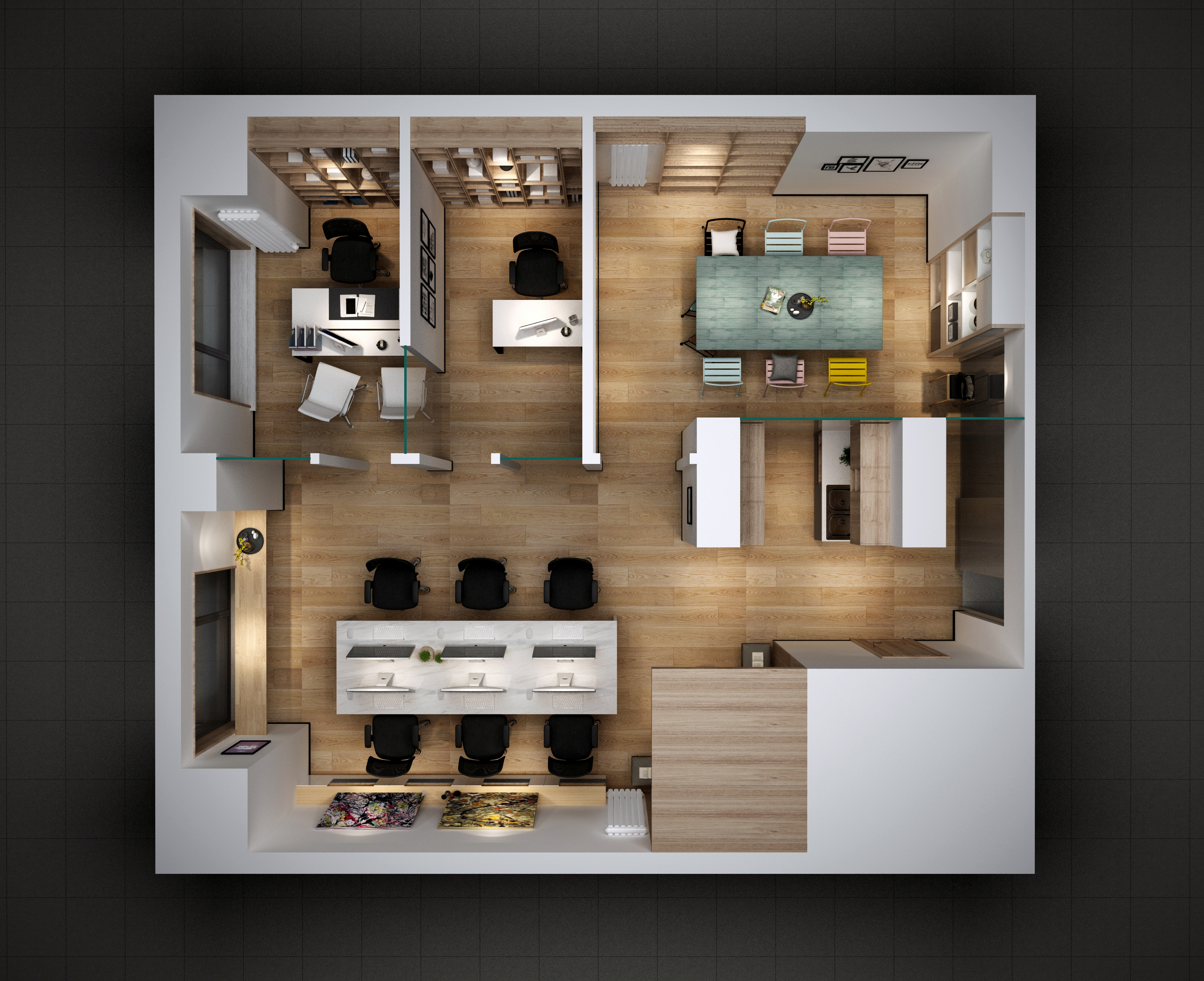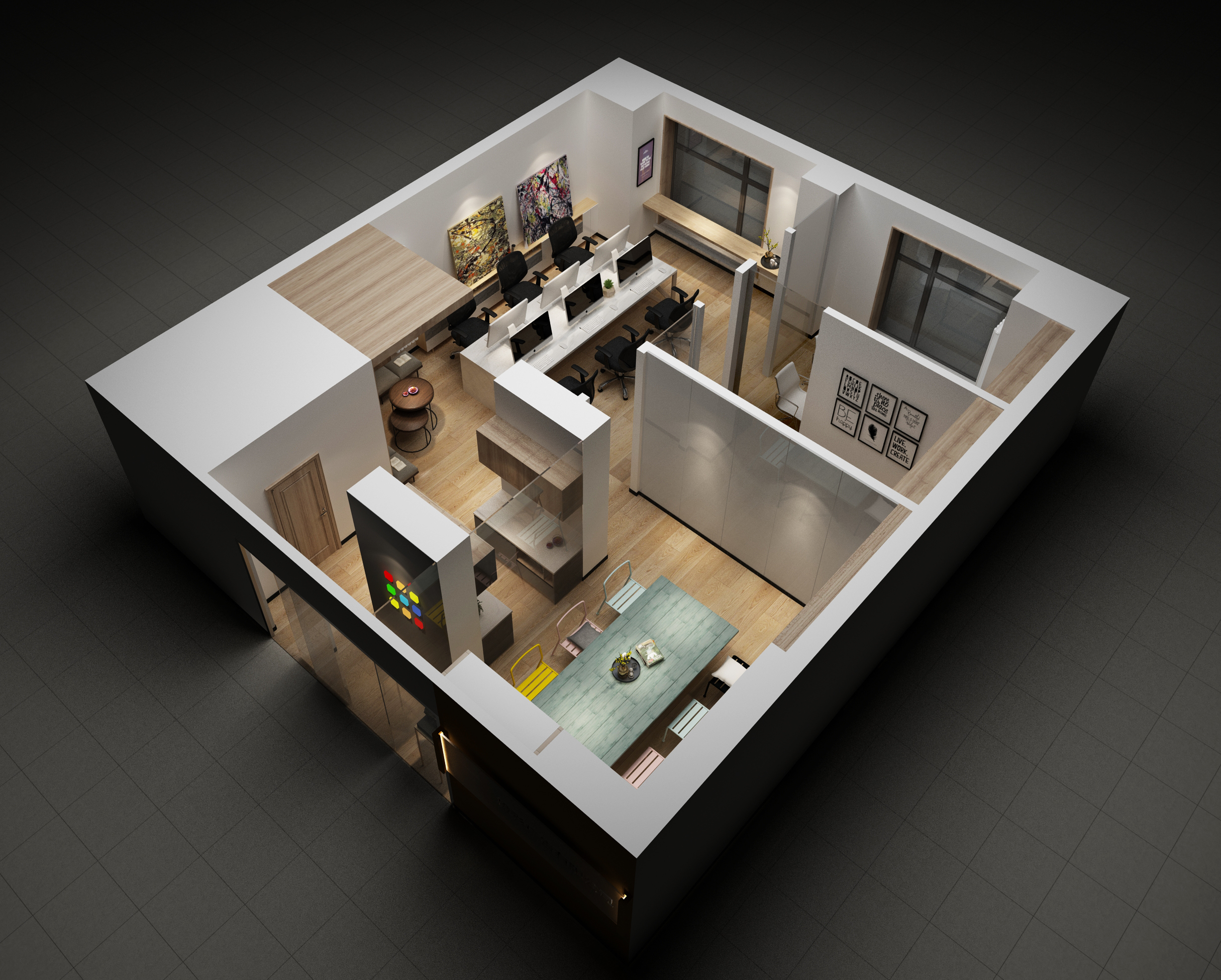 在以上设计案例图中,可以看到有限的空间里设计了会议室,员工办公区域,以及一些特殊的单人办公室(适合于人事行政部,财务室之类)。甚至还有经理办公室。可谓是办公室的功能非常齐全,设计师使用黑色与灰色搭配的方式,能够竟可能的吸收灯光和光线,这使得整个办公室从观感上丝毫没有狭小的感觉,能够劲量给人舒适的余地,同时在办公室之间,办公室和会议室之间使用半墙隔开,这样的区分恰到好处的在扩展观感空间的同时丝毫没有浪费有限尺寸,可谓是十分完美的考量。而独特的窗户,窗台,画册布置,更给予整个帮公司观感上的充足空间感和舒适感,相信在这里办公的人心情一定会愉悦?nbsp;