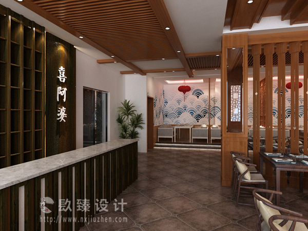 同时,传统的中式风表达出了中华民族的文化底蕴,在设计时结合了现代化的变化和传统的气质融合,适当的留白合理的营造出一种东方人特有的情怀,整体的餐桌以及其它木质家具颜色选用比较沉稳的棕色木材来装饰,墙上的壁画及门窗设计给中式喜阿婆粥饼店增添了不一样的气质、/span>