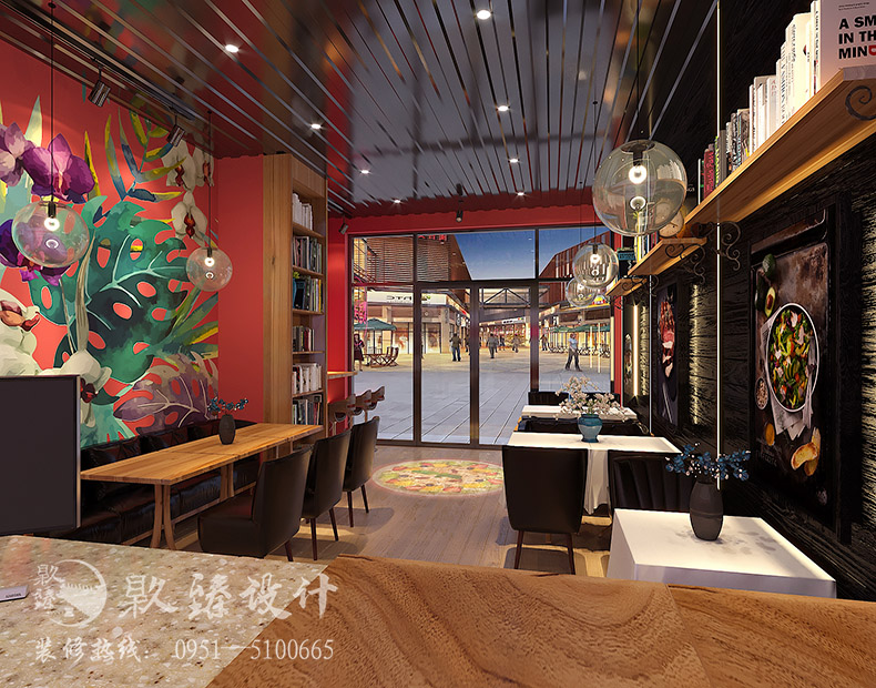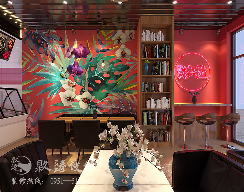 的成分在里面,大概是银川装修公司|镹臻设计|甜品店装修设讠/span>|设计师想让来这里就餐的顾客们在这种浪漫,多彩的环境下会更加开心吧、/span>你们看到墙面的彩绘造型了吗?这也是本案例中很大的亮点,艺术与色彩的碰撞摩擦出了不一样的火花,恰好中间设计了书架隔断,又分化出另一个区域,加上了店铹/span>logo,不会显得那么杂乱无章,也许这样的设计,就是华而不乱的体现吧、/span>