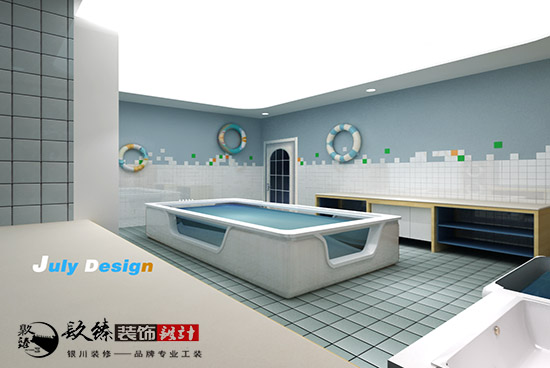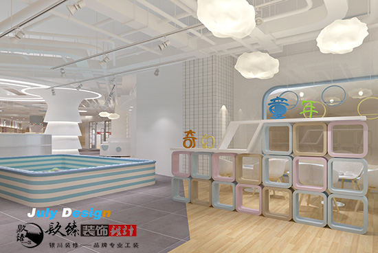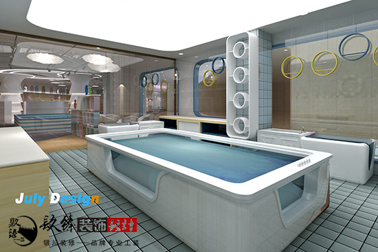 在本套方案中,分为了产品展示区,娱乐区,收银区,还有一个大的区域,就是银川母婴店装修设讠/span>|银川装修罐/span>婴儿游泳区,这里用玻璃作为隔断,很清楚的让外面等候的家长们看到了里面宝宝游泳的场景,满是温馨的画面、/span>