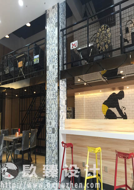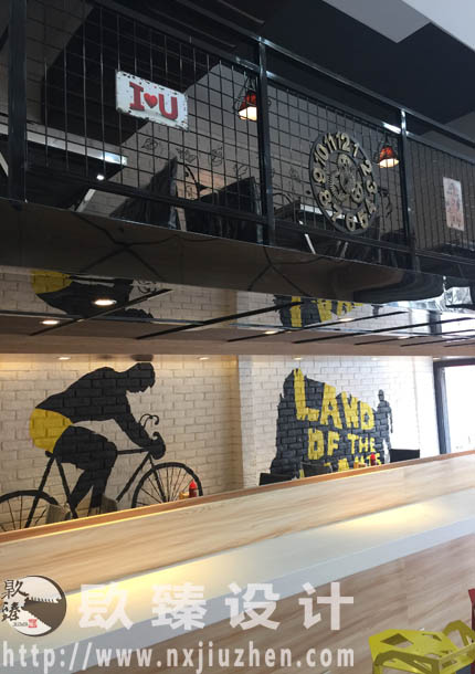该店总共有两层,一楼最里面的是开放性的厨房,这样的设计一方面可以让人直观的看到美食的整个制作过程,另一方面也可以相信该店的卫生安全。左边是一面白色的PK砖墙,搭配简单温馨的吊灯,使得整体看上去和谐大气,中间做了简单的格挡处理,一排长桌搭配五颜六色的吧台凳,在色调上显得更加活泼和自然,使得原本的黑色不在那么沉重。右边是用餐区,但是小编想特别强调的是手绘墙,这可是真实手绘上去的哦!